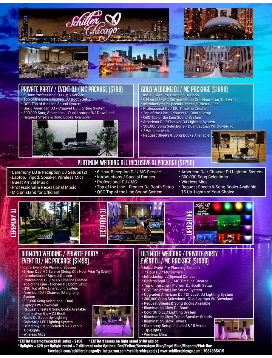 Established over eleven years ago, Schiller Chicago is a veteran DJ company dedicated to offering the best DJ/MC/Lighting/Sound packages in Chicago. Our team of professional veteran DJs guarantees the success of every event. We take immense pride and passion in our work, understanding the significance of creating a memorable experience for you and your guests. Our philosophy revolves around providing Chicagoland with affordable and professional sound, lighting, and DJ packages, ensuring we fulfill promises and deliver an exceptional experience.